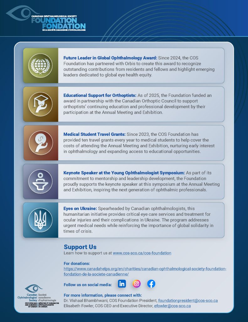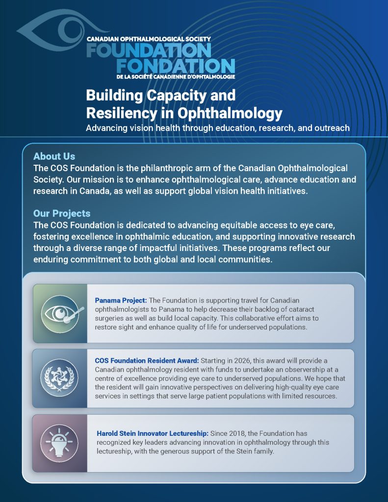 The COS Foundation is the philanthropic and outreach arm of the Canadian Ophthalmological Society. The goal of the COS Foundation is to enhance ophthalmological care and to advance education and research in the field of ophthalmology in Canada. It is through the COS Foundation that we aim to help those around the world access crucial resources for vision health.