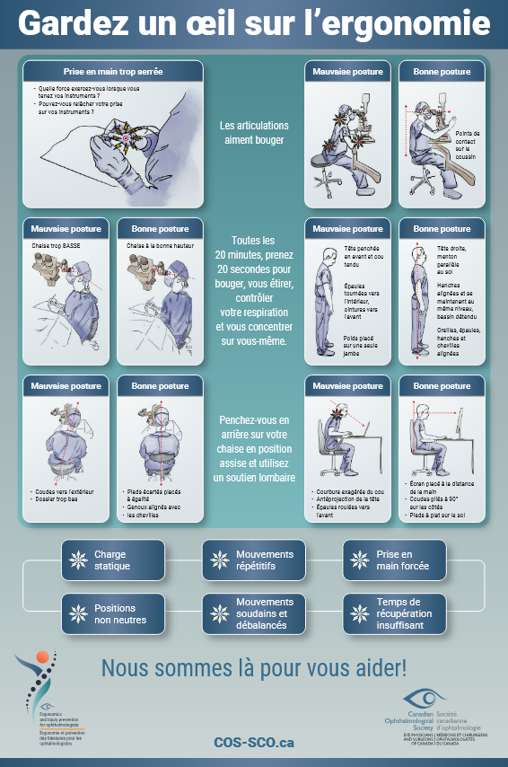Le Groupe de travail sur l’ergonomie et la prévention des blessures vise à sensibiliser les ophtalmologistes et stagiaires canadiens aux stratégies ergonomiques – à la maison, à la clinique ou en salle d’opération – permettant d’atténuer les risques liés aux blessures professionnelles. Les initiatives incluront des webinaires, des séances en personne au Congrès annuel de la SCO, des campagnes dans les médias sociaux et la préparation de matériel de formation destiné aux médecins à toutes les étapes de leur carrière. Nous sommes là pour vous aider!